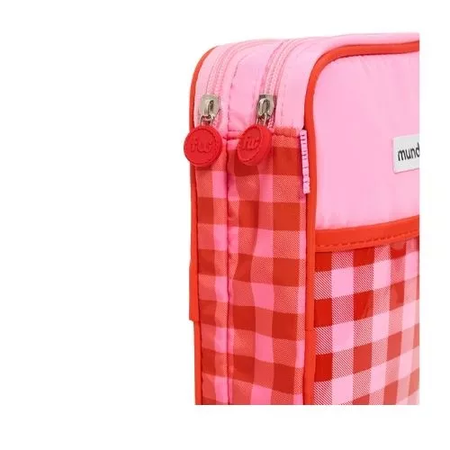 de colores vibrantes, diseñada para facilitar el transporte gracias a su carro incorporado. En la parte frontal, cuenta con dos bolsillos con cierres,y dos bolsillos laterales con red para la botella, cada uno con accesorios decorativos, perfectos para organizar pequeños objetos