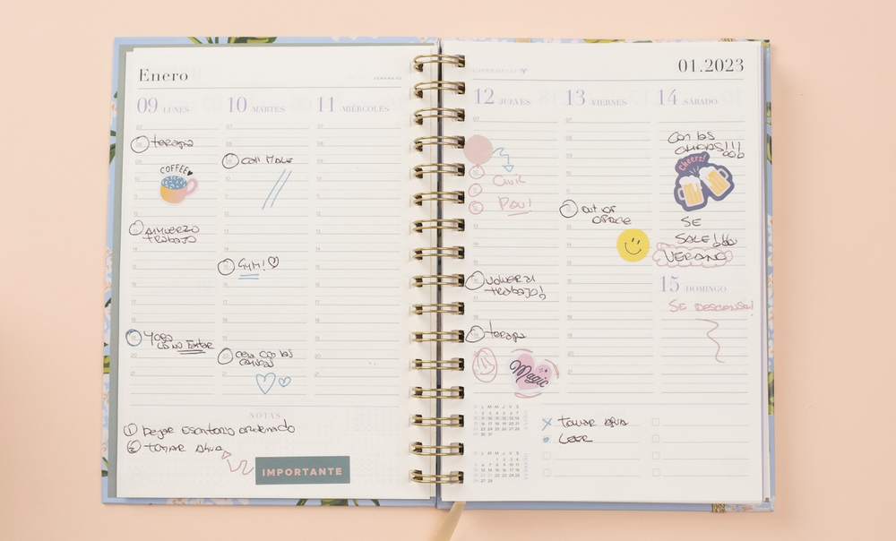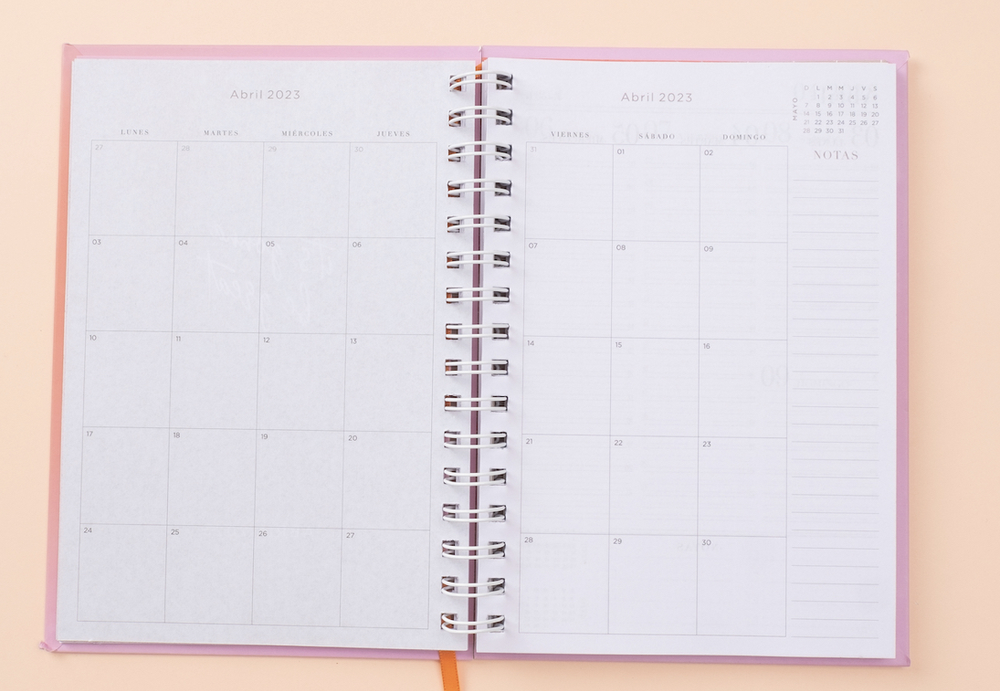 El tamaño MAXI es sin duda el tamaño más usado. Es ideal para tener en el escritorio, en la mesada de tu casa o en la oficina. Llena de espacio para anotar tus horarios y cosas por hacer. Linea con diseños para llenarte de energía. Diseños: Present (impreso en papel cobre con elástico y cinta señaladora nude) / Proceso : full stamping oro con espiral rosa, elástico y cinta señaladora rosa / My happy place : full stamping oto en tapa y contratapa, elástico dorado lurex y cinta señaladora oro. Detalles agenda: