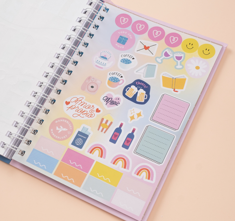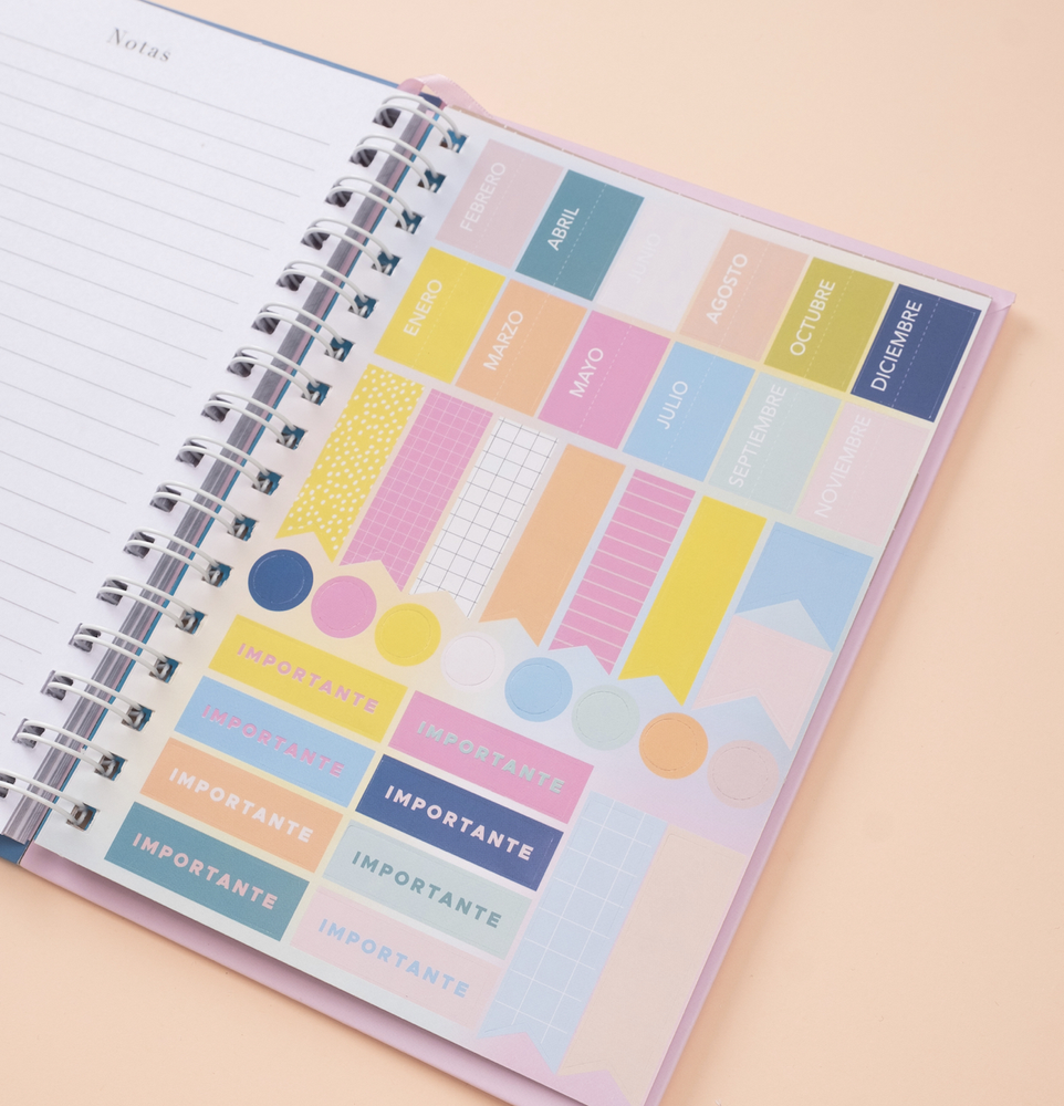 páginas de notas 52 páginas de notas 2 hojas de stickers – 98 Sobre con diseño laminado 160g Cinta señaladora + elástico a tono